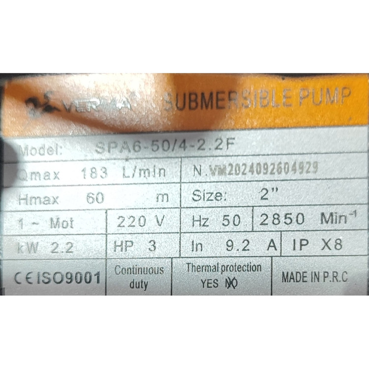 پمپ کف کش ورما SPA6-50/4-2.2F، با توان 2.2 کیلووات و 3 اسب بخار از بهترین پمپ های کف کش ساخت کشور چین است. حداکثر دبی این مدل از پمپ 11 متر مکعب در ساعت بوده و حداکثر ارتفاع آن 60 متر است. پمپ کفکش ورما سری SPA6 قادر به عملکرد در شرایط سخت می باشد و به دلیل دارا بودن پیچ و مهره های ضد زنگ دارای عمر طولانی است. شدت جریان الکتریکی این مدل از پمپ کفکش معادل 2.9 آمپر بوده و مجهز به فلوتر می باشد.