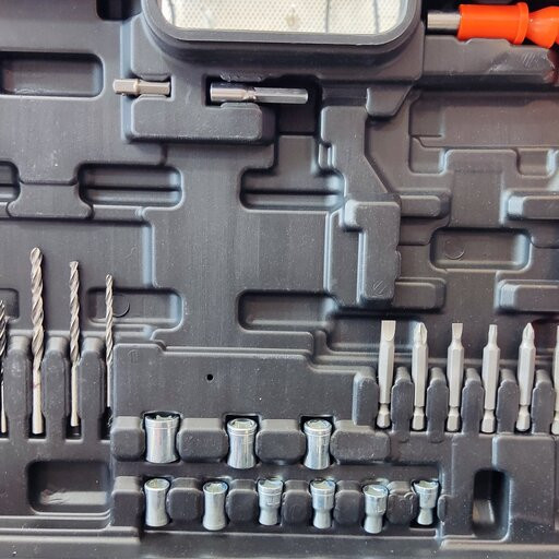کیف حمل، 6 عدد مته چوب و آهن، رابط خرطومی، 9 عدد بکس، 6 عدد سر پیچ گوشتی، رابط و تبدیل، دفترچه راهنما