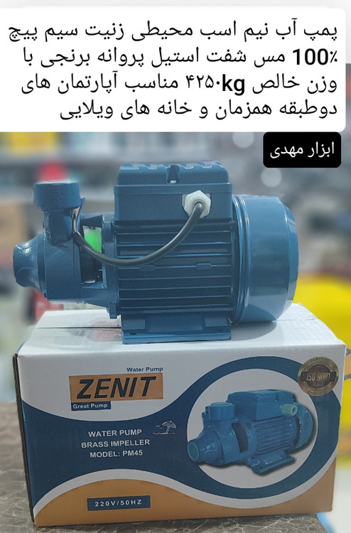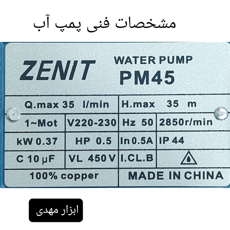 پمپ آب نیم اسب زنیت مدل pm 45 سیم پیچ تمام مس شفت استیل و پروانه برنجی