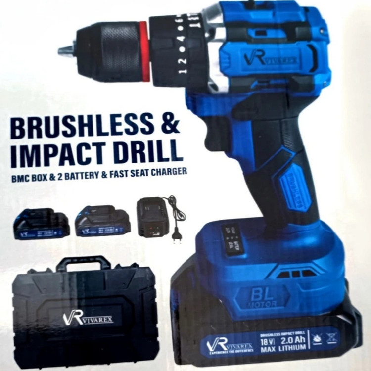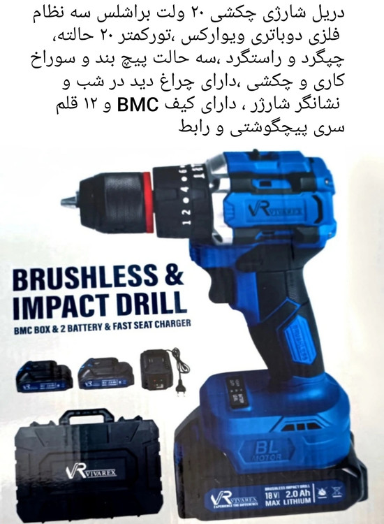 سایر توضیحات دریل شارژی صنعتی ویوارکس سری جدید هنگام خرید ب مدل دستگاه دقت کنید مدل: VR1810V-IBL دریل شارژی چکشی براشلس 18ولت حقیقی 2امپر با موتور براشلس صنعتی و باتری های سوپر سایز مکعبی(تخت) . این دریل دارای 4 مدرک بین المللی از جمله iso9001 برای کیفیت ساخت بالا/ و مابقی برای قیمت پایین/قدرت و گارانتی معتبر میباشد . دارای کلید گازی نمایشگر مقدار شارژ باقیمانده 2عدد باتری سوپر شارژر لیتیومی شارژر بزرگ حرفه ای مدل فست شارژ دارای 3حالت چکشی/پیچبند/دریل چراغ قوه مستقیم روی کار سه نظام اتومات صنعتی فلزی چپگرد راستگرد دور تند و کند ترکمتر تنظیم قدرت جعبه سایز بزرگ ضد ضربه bmc . مناسب برای مصارف کارگاهی و خانگیویژگیهای دریلسیستم گردش چپگرد سیستم گردش راستگرد قابلیت کنترل سرعت سیستم ضربه زن