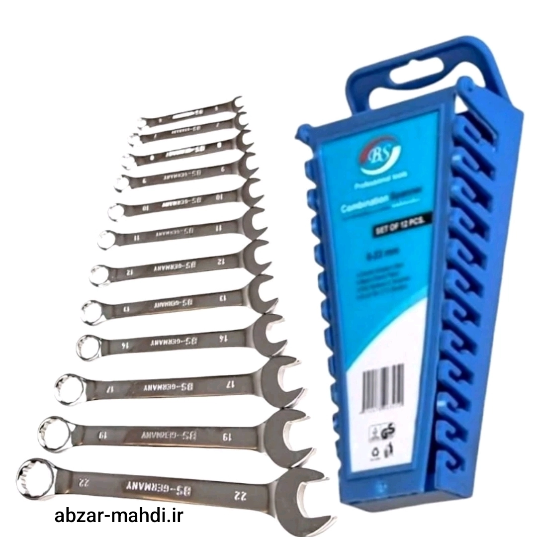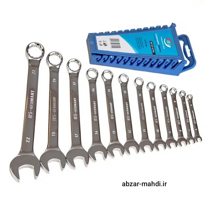 این مجموعه آچار ۱۲ عددیBS به سفارش آلمان شامل سایزهای ۶-۷-۸-۹-۱۰-۱۱-۱۲-۱۳-۱۴-۱۷-۱۹ و ۲۲ میلی متر است. BS از جمله مارک های با کیفیت و معروف ساخت کشور هند است که به سفارش آلمان تولید میشود ست ۱۲ عددی آچار یک سر تخت یک سر رینگ ارائه شده در این قسمت به آچار پلکانی معروف است.