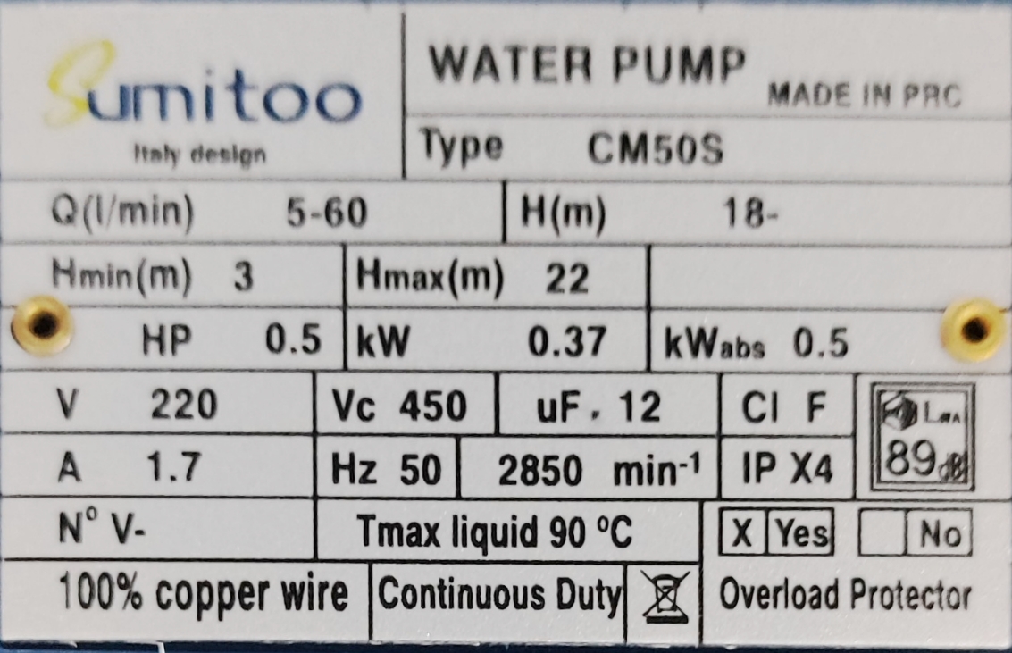 پمپ آب نیم اسب بشقابی سومیتو این پمپ با توان 0.37 کیلووات یا نیم اسب بخار برای سیستم های آبرسانی خانگی ،انتقال سیالات غیر اسیدی شبیه به آب،تامین سیال برج خنک کننده وسیستم های آبیاری و باغبانی و کشاورزی برای تقویت فشار مورد استفاده قرار میگیرد این پمپ ازمحصولات برند چینی معتبر ویگو میباشد ودارای ظرفیت تولید دبی 0.5 متر مکعب بر ساعت وحداکثر هد 22 متر میباشد این پمپ تکفازدارای ورودی یک و خروجی سایز یک اینچ و شافت استنلس استیل 304 میباشد عملکرد این پمپ به صورت سانتریفیوژ بوده و ازمزایای این پمپ مصرف پایین انرژی و کم حجم و و امکان تامین فشار بالا و همچنین نصب و تعمیر و نگهداری آسان نام برد این پمپ برای ساختمانها ی حداکثر 2 طبقه همزمان و آپارتمانهایی که مشکل کمبود فشاردارند برای داخل واحد قابل استفاده میباشد و فوق العاده کم صدا میباشد