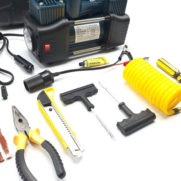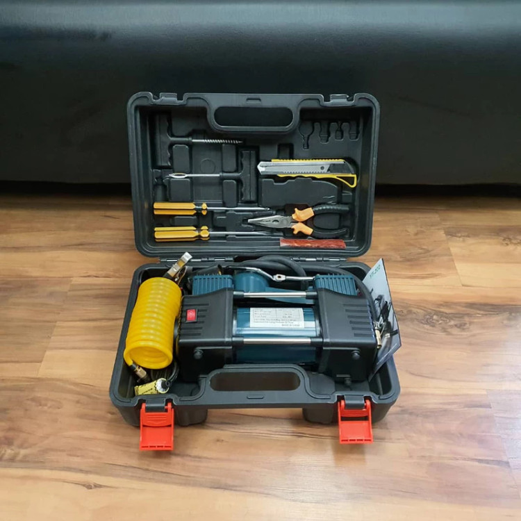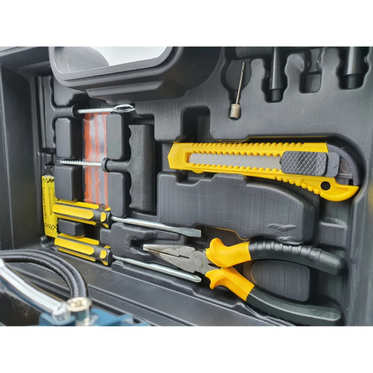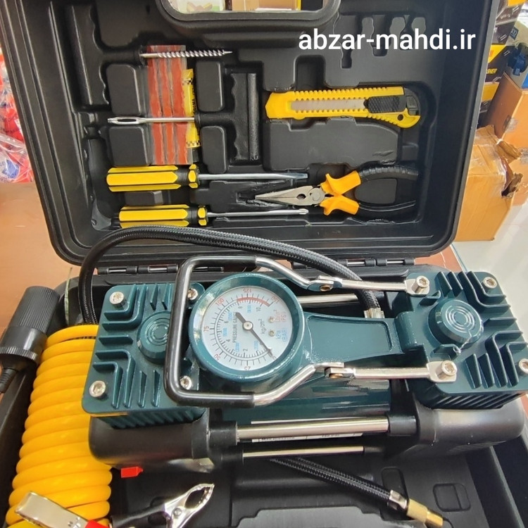 - دارای متعلقات کاربردی شلنگ فنری به طول 5 متر، دمباریک، کاتر، انبرک های پنچر گیری، پیچ گوشتی دوسو و چهارسو، وصله پنچرگیری، چسب پنچرگیری، تبدیل فندکی به سر باتری، سه عدد سری (جهت باد زدن توپ، دوچرخه، قایق بادی و .)