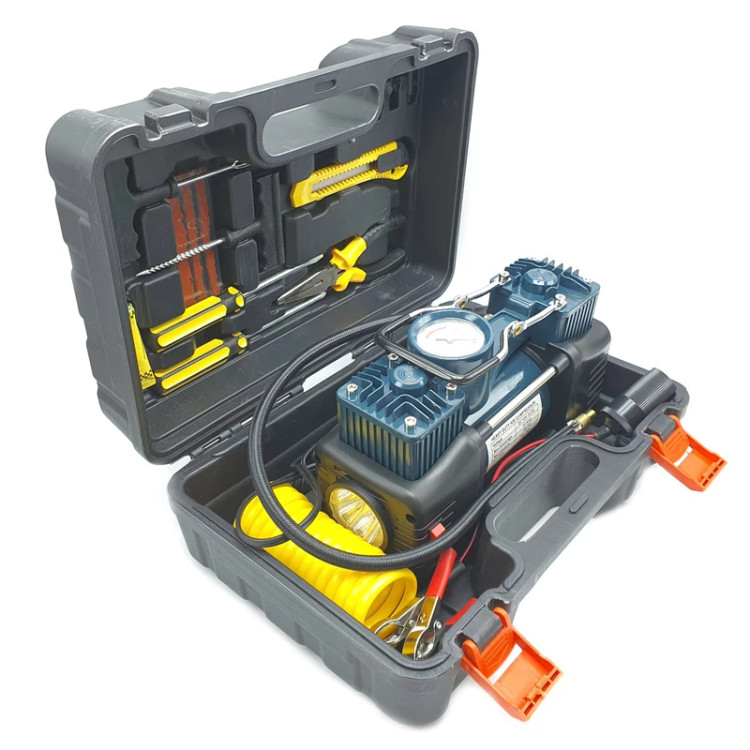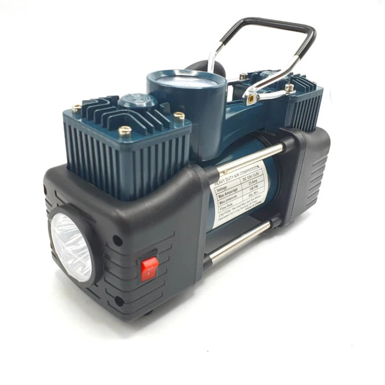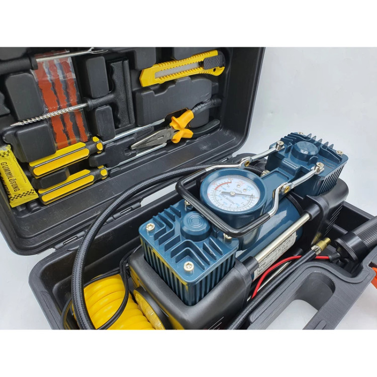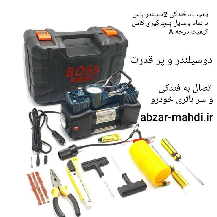 کمپرسور فندکی دوسیلندر باس مدل DC12V با تمام وسایل پنچرگیری و کیف BMC