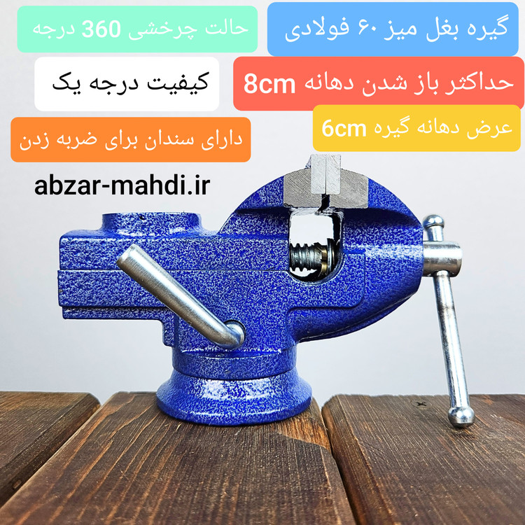 عرض دهانه گیره حداکثر ۶سانتی متر ( ۶۰ میلی متر ) است و حداکثر باز شدن دهانه ۸ سانتیمتر است ،قابلیت چرخش ۳۶۰ درجه را برای سهولت کار بر روی قطعه مورد نظر داراست. در ضمن دارای سندان محکم برای ضربه زدن نیز میباشد