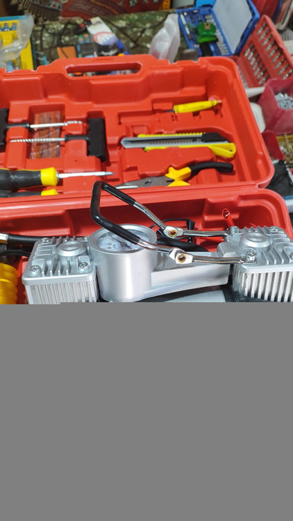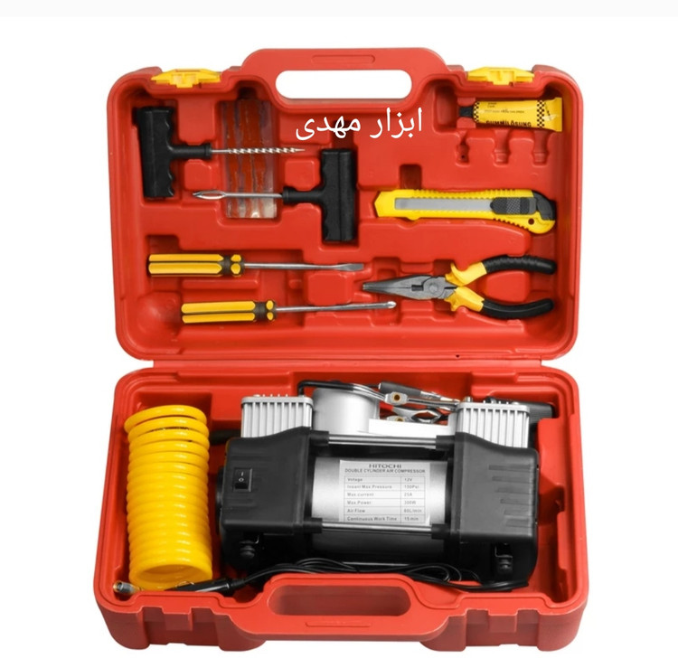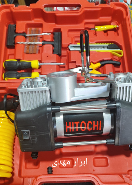 پمپ باد فندکی دو سیلندر هیتوچی با تمام لوازم مدل 12V چراغ قوه دار