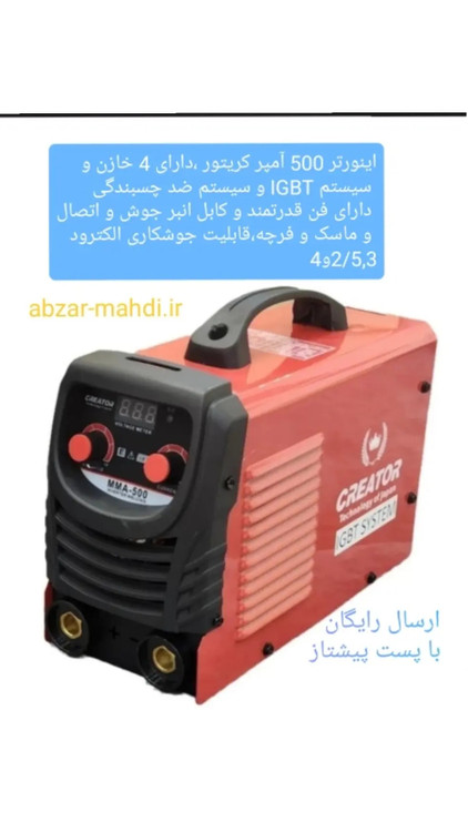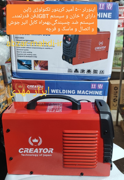اینورتر جوشکاری کریتور تکنولوژی ژاپنCREATOR MMA 500 CREATOR MMA-500 ویژگی: دارای دو ولوم ولتاژ ورودی: 220 ولت وزن: 3500 نمایشگر دیجیتال: دارد مناسب برای: الکترود 1 تا ۴ ماسک: دارد گارانتی: گارانتی ضمانت سلامت فنی/فیزیکی کابل نری: دارد کابل اتصال: دارد قابلیت: تکنولوژی ژاپن فرچه: دارد شیشه ماسک: دارد خازن: 4 عدد ترانزیستور: 4 عدد آمپر: 500 آمپر نامی طراحی زیبای و قابلیت بالا در کارایی و قیمت مناسب این اینورتر نظر مشتریان زیادی رو ب خودش جلب کرده و ب یکی از پرفروشترین اینورترها در سطح کشور تبدیل شده، پیشنهاد میکنم اگر تمایل ب خرید دستکاه جوش دارید حتما اینورتر ۵۰۰ آمپر کریتور رو تو سبد خریدتون قرار بدید این اینورتر برای کارهای نیمه صنعتی و خانگی بسیار مناسب می باشد.