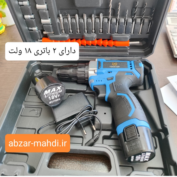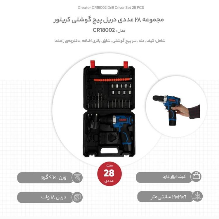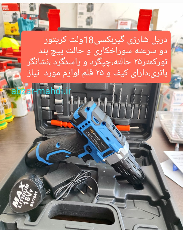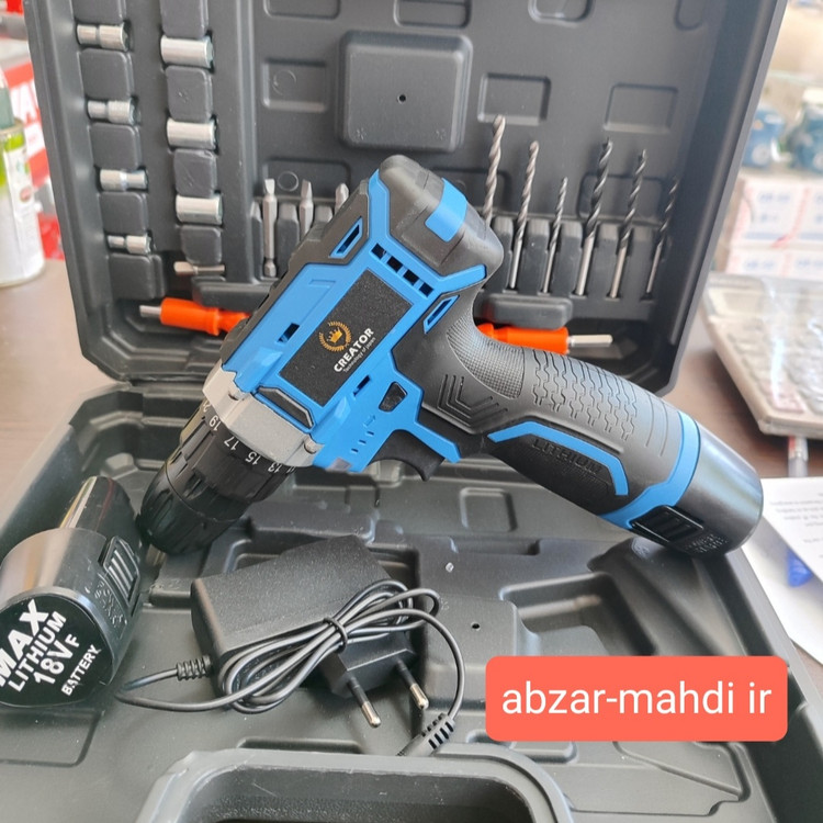 دریل شارژی گیربکسی ۱۸ ولت کریتور مدل CR18002 بهمراه کیف و ۲۵ عدد لوازم