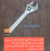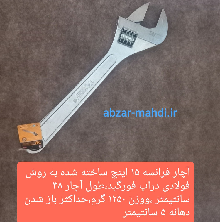 آچار فرانسه سایز 15 یک ابزار بزرگ حساب می شود که برای کارهای سنگین و نسبتا حرفه ای کاربرد دارد. این آچار فرانسه با طولی حدودا 38 سانتی با روش فورج ساخته شده است و از کیفیت بالایی برخوردار است. دهانه فک این ابزار حدود 5 سانت باز می شود که بیشتر قطعات و اتصالات سایز بزرگ را می توان به وسیله آن باز و بسته کرد.
