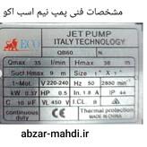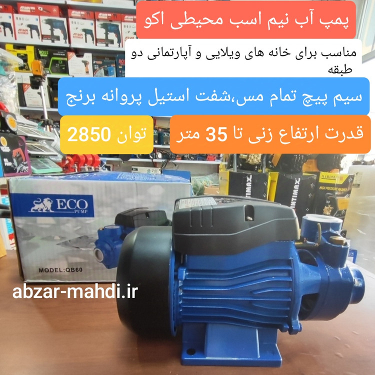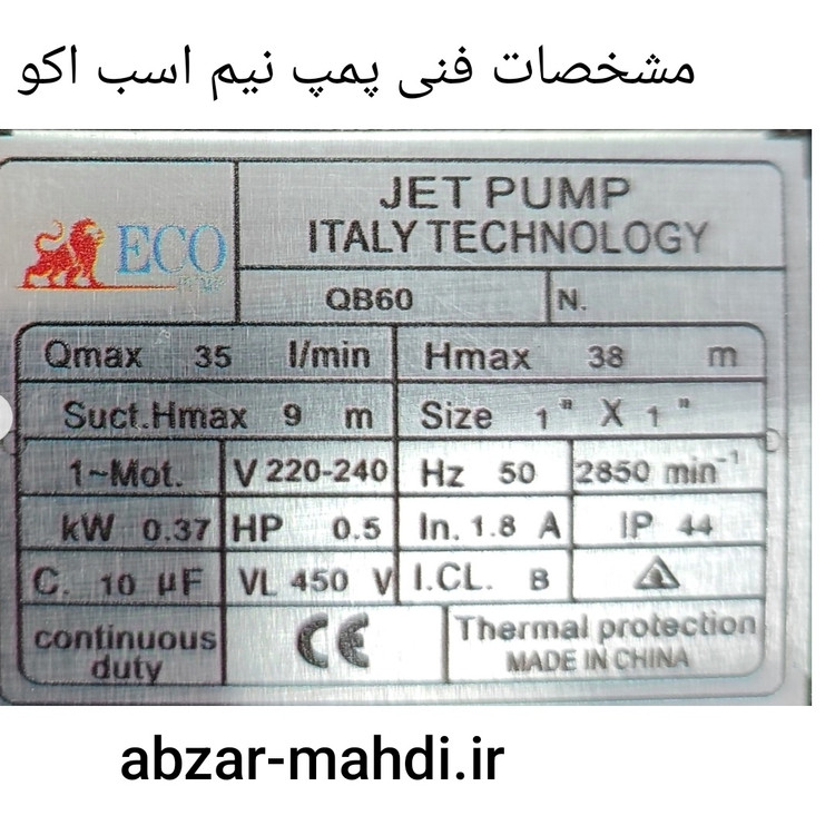 پمپ آب نیم اسب برند اکو از ویژگیهای این پمپ آب میتوان به سیم پیچی مس و پروانه برنجی اشاره نمود