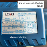 پمپ آب نیم اسب لوکو مدل pm45 با قدرت 0.5 HP و توان0.37 کیلووات و جریان 2.5 آمپر توانایی جابجایی آب را دارد. وزن خالص این پمپ 5/750 کیلوگرم است. برای کسب اطلاعات بیشتر و دریافت مشاوره رایگان با شماره مندرج در پایین صفحه تماس حاصل فرمایید.