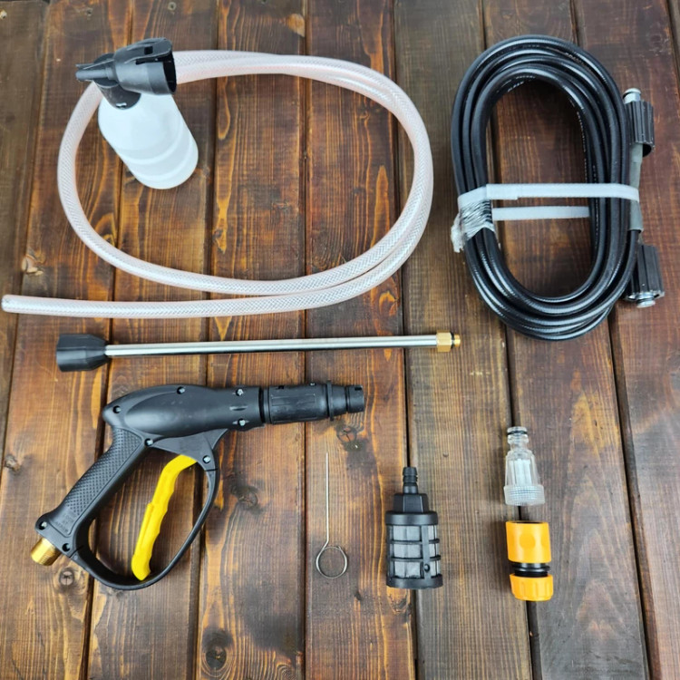 xدارای گان و میله گان، شلنگ فشار قوی بلند، شلنگ مکش، یک عدد اتصالات ورودی، یک عدد فیلتر بزرگ، یک عدد بطری شوینده قابل اتصال به گان می باشد