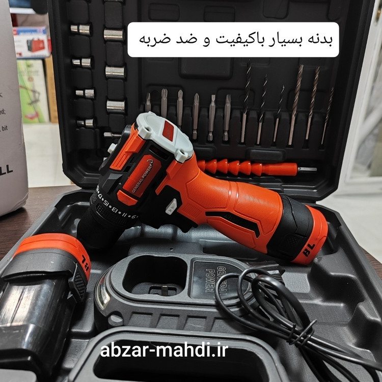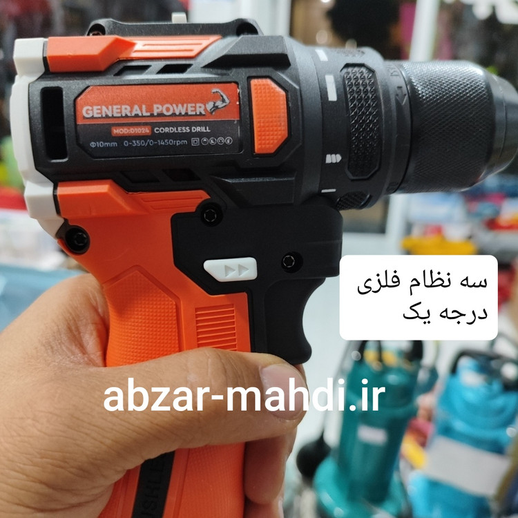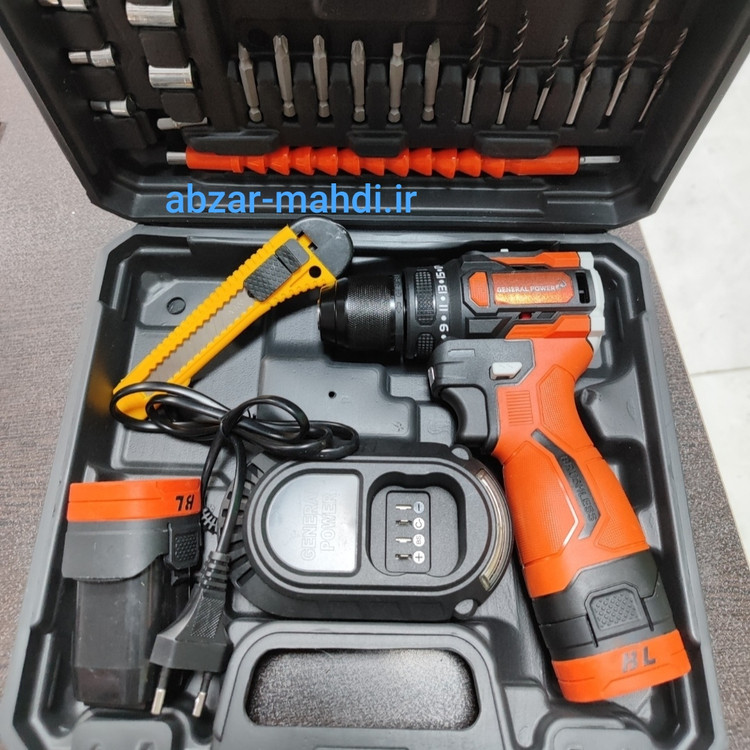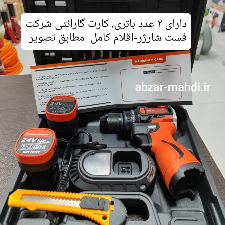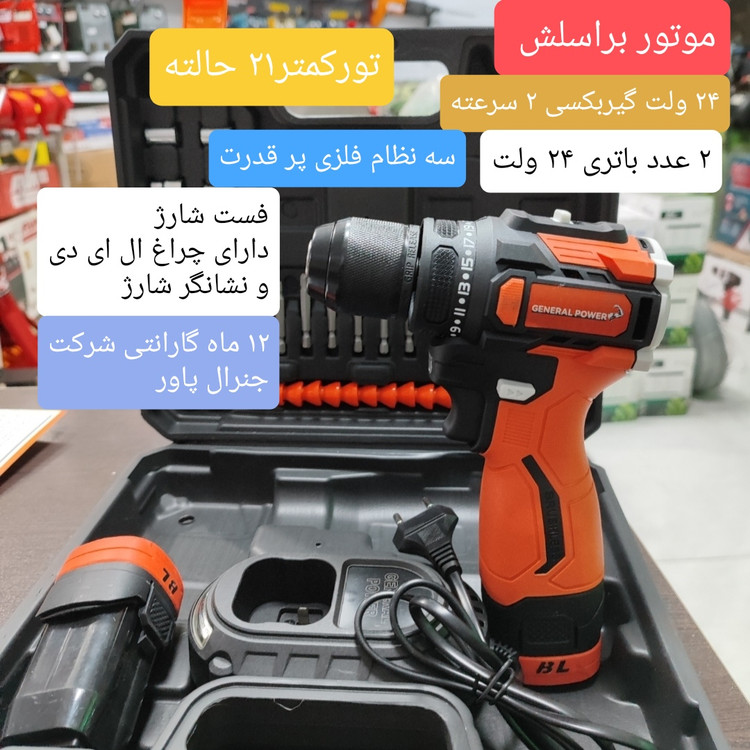 دریل شارژی 24 ولت موتور براسلش جنرال پاور مدل24V سه نظام فلزی با دو باتری و لوازم کامل و یکسال گارانتی شرکت جنرال پاور و خدمات پس از فروش