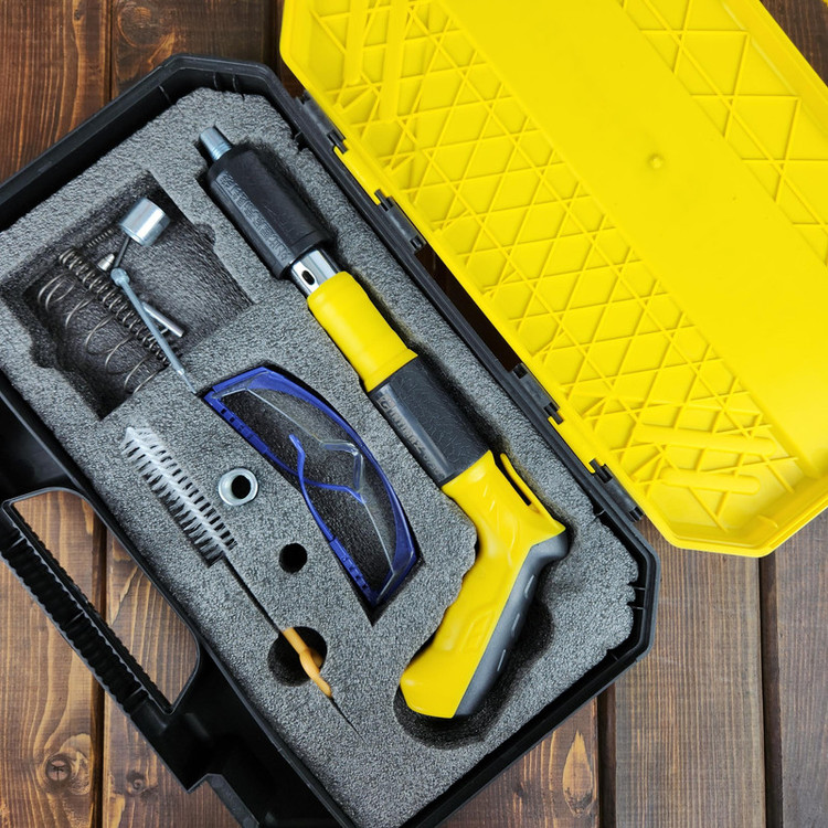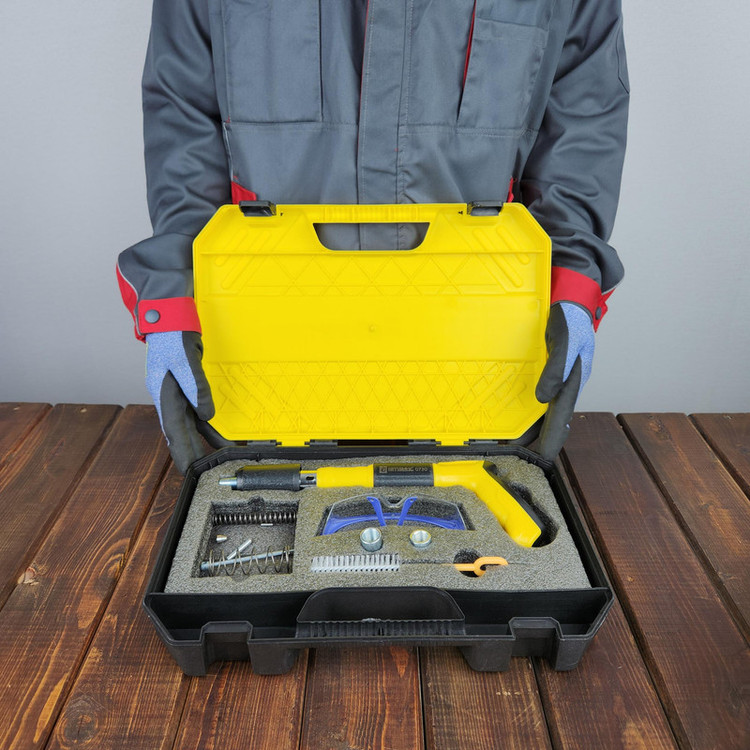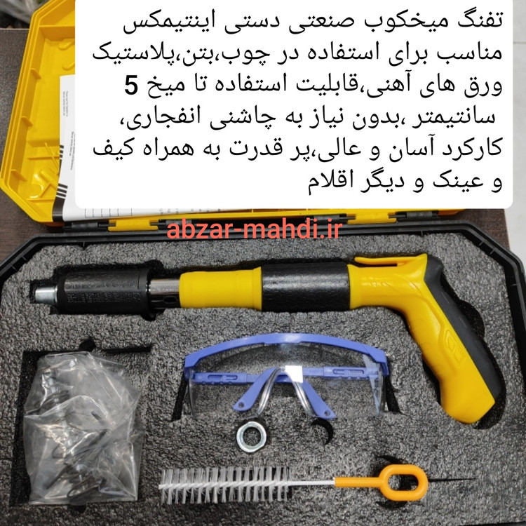 xامکان استفاده در بتن، پلاستیک، ورق های نازک فلزی، چوب و … را دارد xقابلیت استفاده میخ تا 5 سانتیمتر را دارد xکارکرد ساده و قوی دارد xبدون نیاز به چاشنی انفجاری جداگانه می باشد xبسیار سبک، کم حجم وقابل حمل می باشد xمحصولی جدید و با تکنولوژی به روز جهت جایگزینی برای میخکوب های والتی، کامرکس و … می باشد xبدون نیاز به چاشنی انفجاری می باشد xدارای کیف حمل، عینک، فرچه، فنر یدک می باشد تفنک میخکوب ابزاری است مشابه تفنگ بادی است. تفنگ میخکوب بتن برای اتصال پلیت ها و صفحات مختلف به بتن می باشد. البته مصارف دیگری از جمله اتصال انواع توری های مشبک و غیره به صفحه های بتنی و مصالح ساختمانی را نیز دارد. این تفنگ ها به وسیله چاشنی میخ موجود در خان تفنگ را با شدت به سمت هدف شلیک کرده و واشری که بر روی میخ قرار دارد صفحه را بر روی بتن نگه می دارد. با قرار دادن چاشنی مخصوص در داخل دستگاه و قرار دادن میخ در محل تعیینشده، میتوانید از این ابزار استفاده کنید. چاشنیهایی که برای این محصول در نظر گرفتهاند در دو نوع و برای کوبیدن میخ در فلز یا بتن هستند. نوع میخی که برای این دستگاه مورد استفاده قرار میگیرد، از گونههای واشردار است. از این دستگاه در شغلهای مختلف که با چوب و فلز سروکار دارند، استفاده میکنند.