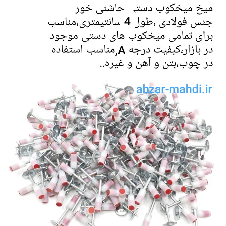 این میخ ها مناسب دستگاه های تفنگ میخکوب دستی می باشند (عکس محصول در تصاویر محصول می باشد) .. در بازار عرضه می گردند. طول کلی این میخ 4سانتیمتر می باشد که 2/7 طول میخ و با چاشنی 4 سانتیمتر میباشد و در ابتدای آن یه محفظه پلاستیکی است که حاوی مواد منفجره جهت شلیک توسط تفنگ است و در انتهای آن یه عدد واشر پهن طراحی شده که به راحتی میخ را روی سطح کار پرچ می کند. در واقع این میخ ها مناسب اتصال دو سطح مختلف روی یکدیگر هستند مانند یک قطعه فلزی روی بتن.چوب یا فلز
