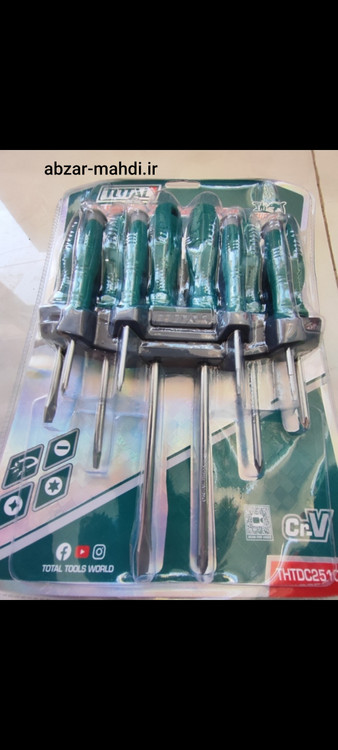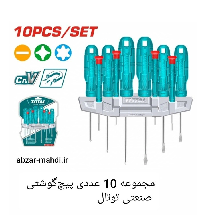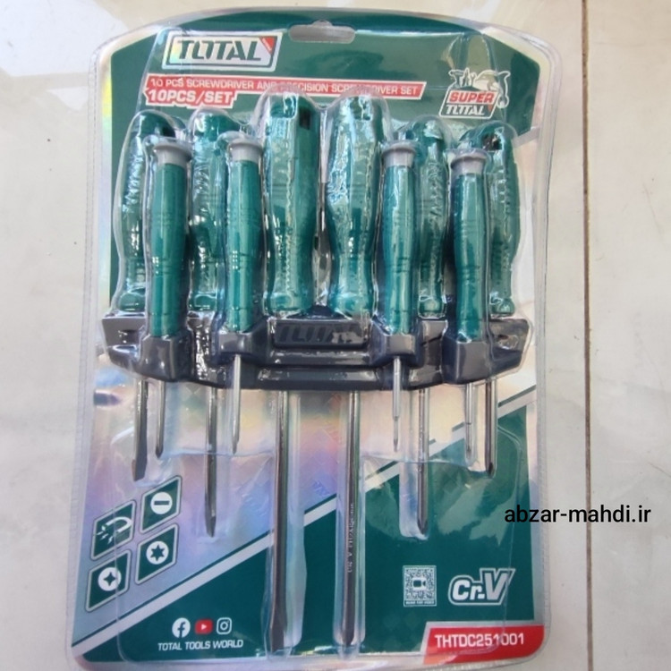 مجموعه 10 عددی پیچ گوشتی توتال از 4 عدد پیچ گوشتی دوسو و 4 عدد پیچ گوشتی چهارسو و دو عدد T6 ,T8 تشکیل شده است که همگی از جنس آلیاژ کروم-وانادیوم هستند.پیچ گوشتیهای دو سوی این مجموعه در سایزهای 3*50 و 5*75 و 5.5*100 و 6.5*150 میلیمتر تولید میشوند. سایزهای پیچ گوشتی چهارسوی این مجموعه نیز عبارتند از: 0*50 و1*75 و 1*100 و 2*150 میلیمتر.این مجموعه پیچ گوشتی 6 عددی، مجهز به دسته پلاستیک هستند. طراحی حرفهای توتال برای دستهها بین سرعت و گشتاور در اتصالات مختلف تعادل ایجاد میکند.