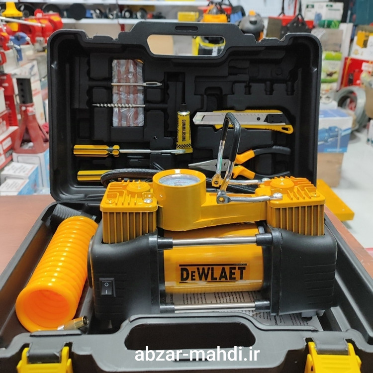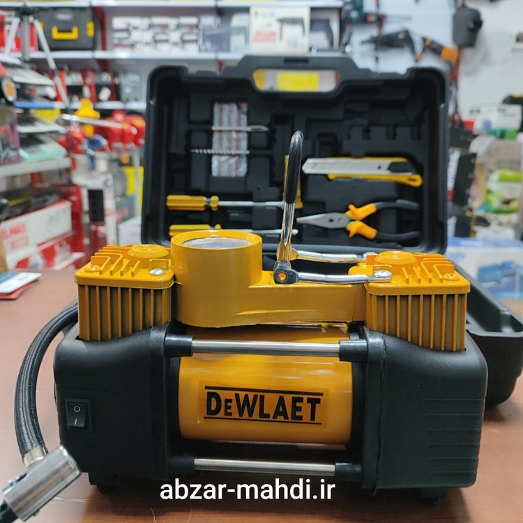 پمپ دیوالت دارای جعبه پلاستیکی محکم قابل حمل و ابزار پنچر گیری و شلنگ فنری که طول ان 5 متر میباشد . با این پمپ میتوان لاستیک موتور ، دوچرخه ، توپ .. را به راحتی باد زد .