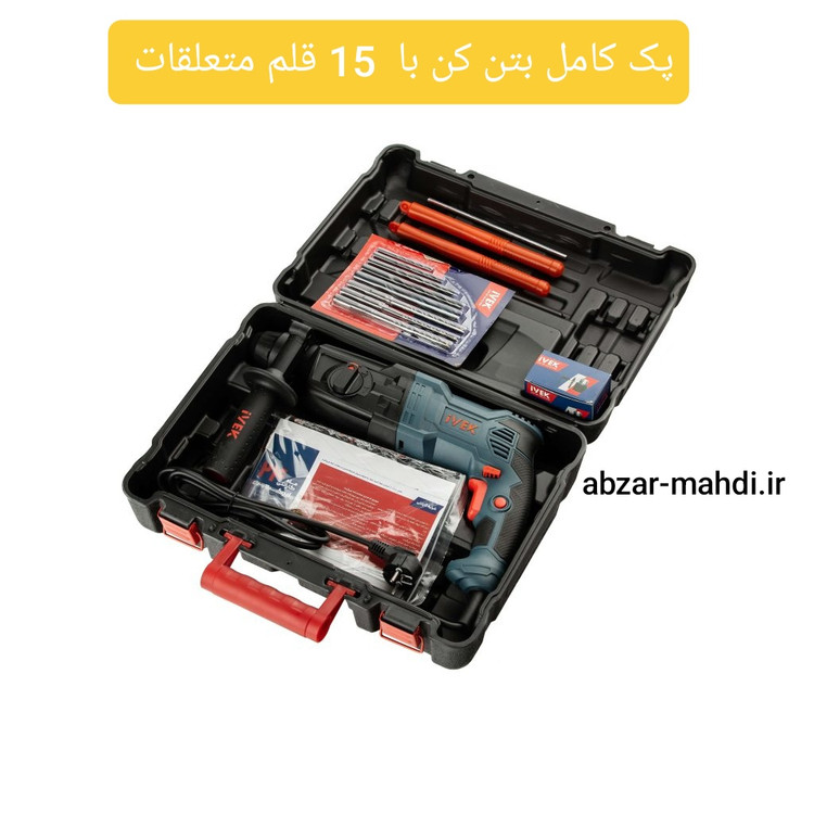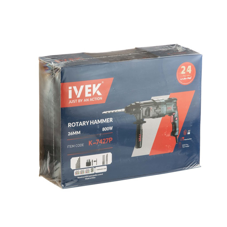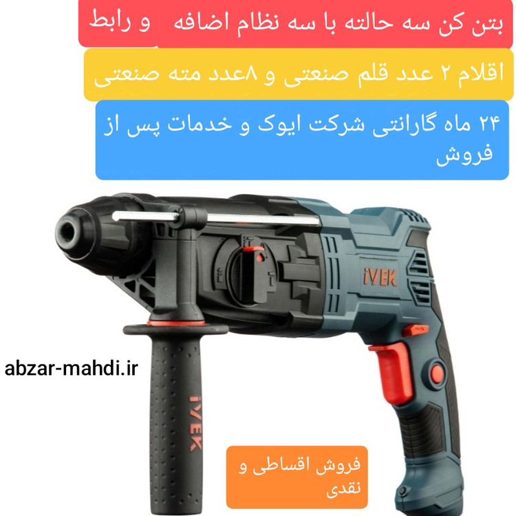 بتن کن سه حالته چکشی گیربکسی26 میلیمتر ایوک مدل K-7427p به اضافه سه نظام ۱۳ میلیمتر و ۲ قلم و ۸ مته صنعتی با ۲۴ ماه گارانتی و خدمات پس از فروش