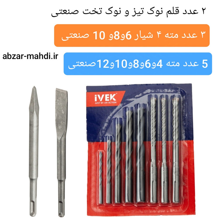 - دارای پنج عدد مته آهن در سایزهای (۴،۶،۸،۱۰،۱۲) میلیمتری