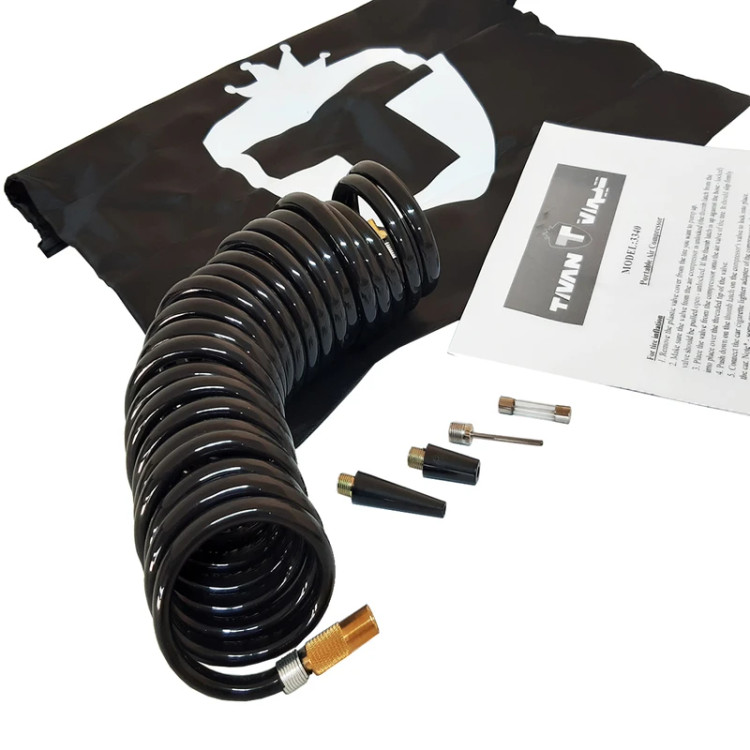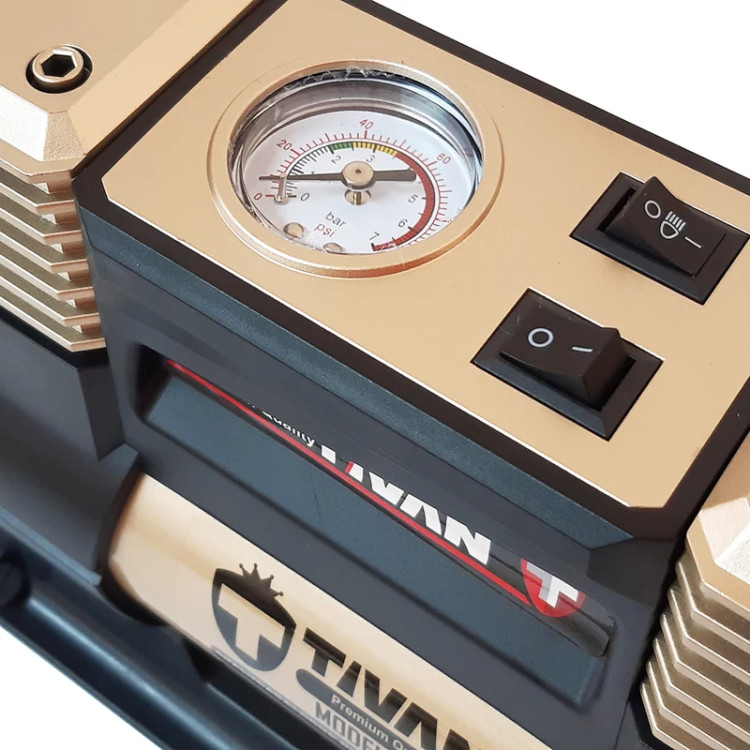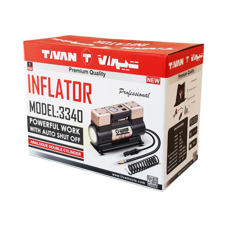 دارای فشارسنج دارای شلنگ کمپرسور باد فندکی تیوان ، با نازل و مبدلهای مختلف، برای بادکردن توپ، تشک و سایر تجهیزات بادی طراحی و تولید شده است. |
