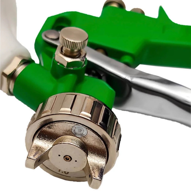 بدنه از جنس برنج و کاسه از پی وی سی سوزن ها از جنس استیل ضد زنگ دارای دسته با طراحی ارگونومیک نازل و کلاهک های تمام برنجی پیچ تنظیم پهنای پاشش رنگ موقعیت مخزن رو