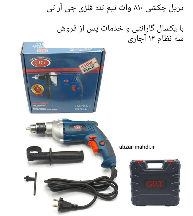 دریل جی آر تیچکشی و نیم تنه فلزی یکی از انواع ابزار های برقی دریل چکشی هستند که از آنها برای سوراخ کاری استفاده می شود. مکانیزم کار در این ابزار به گونه ای است که از طریق چرخش مته در سرعت بالا می توان سوراخ کاری را انجام داد. یکی از انواع دریل که علاوه بر چرخش ،حالت ضربه هم دارد دریل چکشی جی آر تی نامیده می شود. در این دریل ها علاوه بر چرخش می توان از حالت چکشی یا ضربه هم استفاده کرد. دریل چکشی در اصل یکی از انواع دریل ها هستند که کاربرد وسیع تری نسبت به دریل های معمولی دارد و از آنها می توان در سوراخ کاری سطوح سخت و بتنی و گچی و سنگ و سرامیک و ... استفاده کرد.